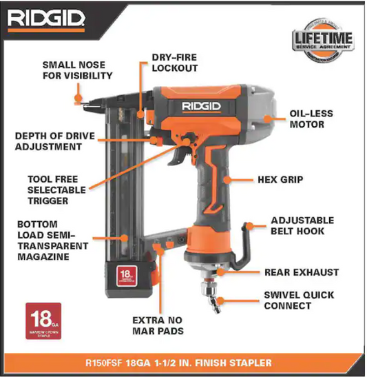 Air Powered Finish Stapler - 18 Gauge 1.5 Inch Straight